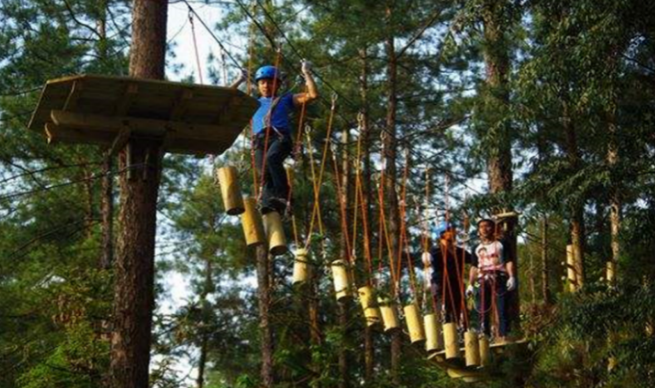 (九)运动拓展区(树上穿越):树上穿越起源于欧洲,是一项健康而又时尚的绿色户外运动,在树与树、树与地面之间设置难度系数不等的关卡让人们参与挑战自我、增强自信;也让人们回归自然、置身于都市森林、天然氧吧中。这是企业文化活动的绝佳选择,是学生名副其实的开心课堂,也是青年人战胜自我的挑战基地,更是家庭娱乐的新颖之地。